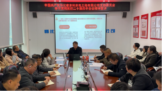 2025年12月29日上午,懷化市產(chǎn)業(yè)投資集團有限公司黨委副書記、總經(jīng)理王旭一行赴水利水電工程公司,以《深學(xué)細(xì)悟全會精神 勇?lián)母锇l(fā)展使命 奮力書寫懷化產(chǎn)投集團高質(zhì)量發(fā)展新篇章》為主題,開展黨的二十屆四中全會精神專題宣講,公司在家全體員工參會。