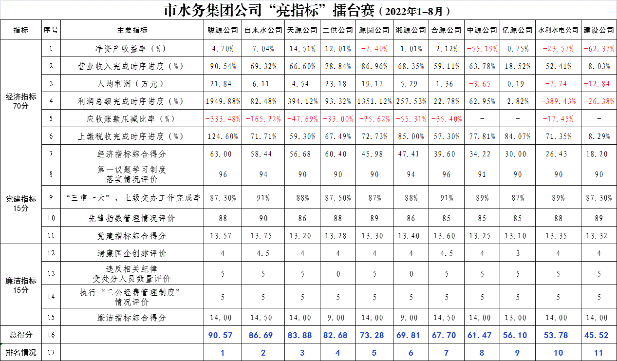 “三整頓、兩提升”,奮起二次創(chuàng)業(yè)——市水務(wù)集團(tuán)公司“亮指標(biāo)”擂臺賽(2022年1-8月)