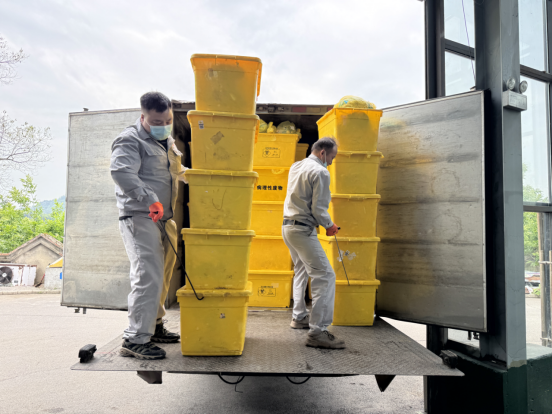 中午時(shí)分,烈日當(dāng)空,收運(yùn)車箱內(nèi)溫度高達(dá)40多度。穿著防護(hù)服的收運(yùn)人員,汗水止不住地流淌,很快就濕透了衣衫。但他們沒有半句怨言,“醫(yī)療廢物不能長時(shí)間存放,必須盡快轉(zhuǎn)運(yùn)處理,我們辛苦點(diǎn)沒關(guān)系,不能影響城市的安全”。一位年輕的轉(zhuǎn)運(yùn)職工堅(jiān)定地說。